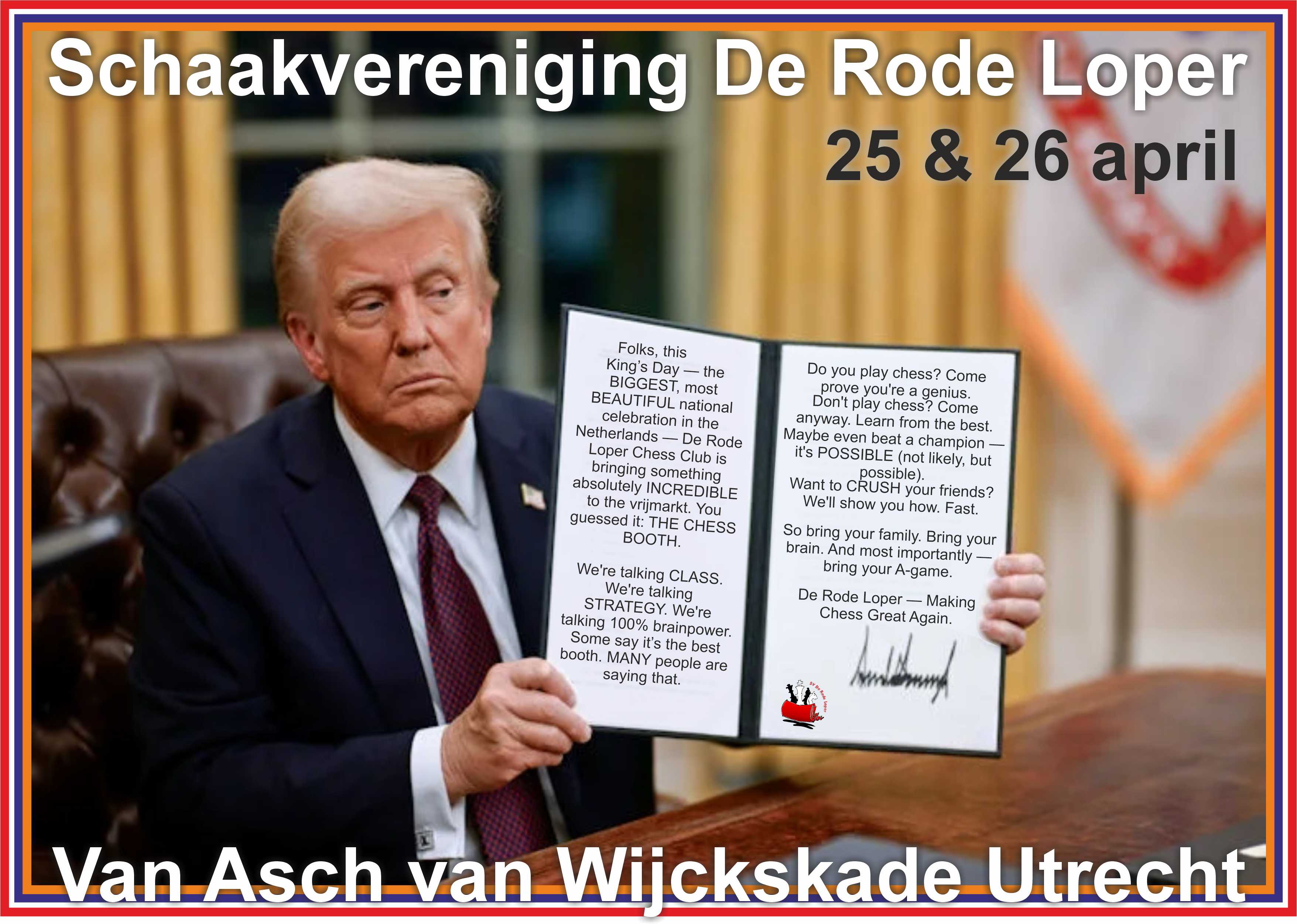 Het feest begint dit jaar een dagje eerder dan gebruikelijk, namelijk op vrijdag 25 april rond 18 uur en gaat door tot ca. 1 uur. De volgende dag zijn we vanaf ca. 10 uur weer in bedrijf. Iedereen die dat leuk vindt is welkom om een potje te komen schaken. De formule is in alle jaren niet veranderd: de Rode Lopers bemannen de borden en spelen tegen het publiek,