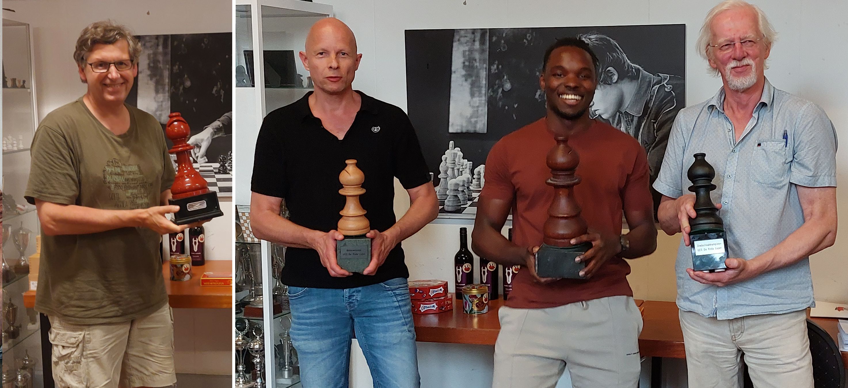 V.l.n.r.: KO-winnaar Coen Stehouwer, Bekerwinnaar Chris Regeling, clubkampioen Nonso Ezeoke en snelschaakkampioen Jan Prins.