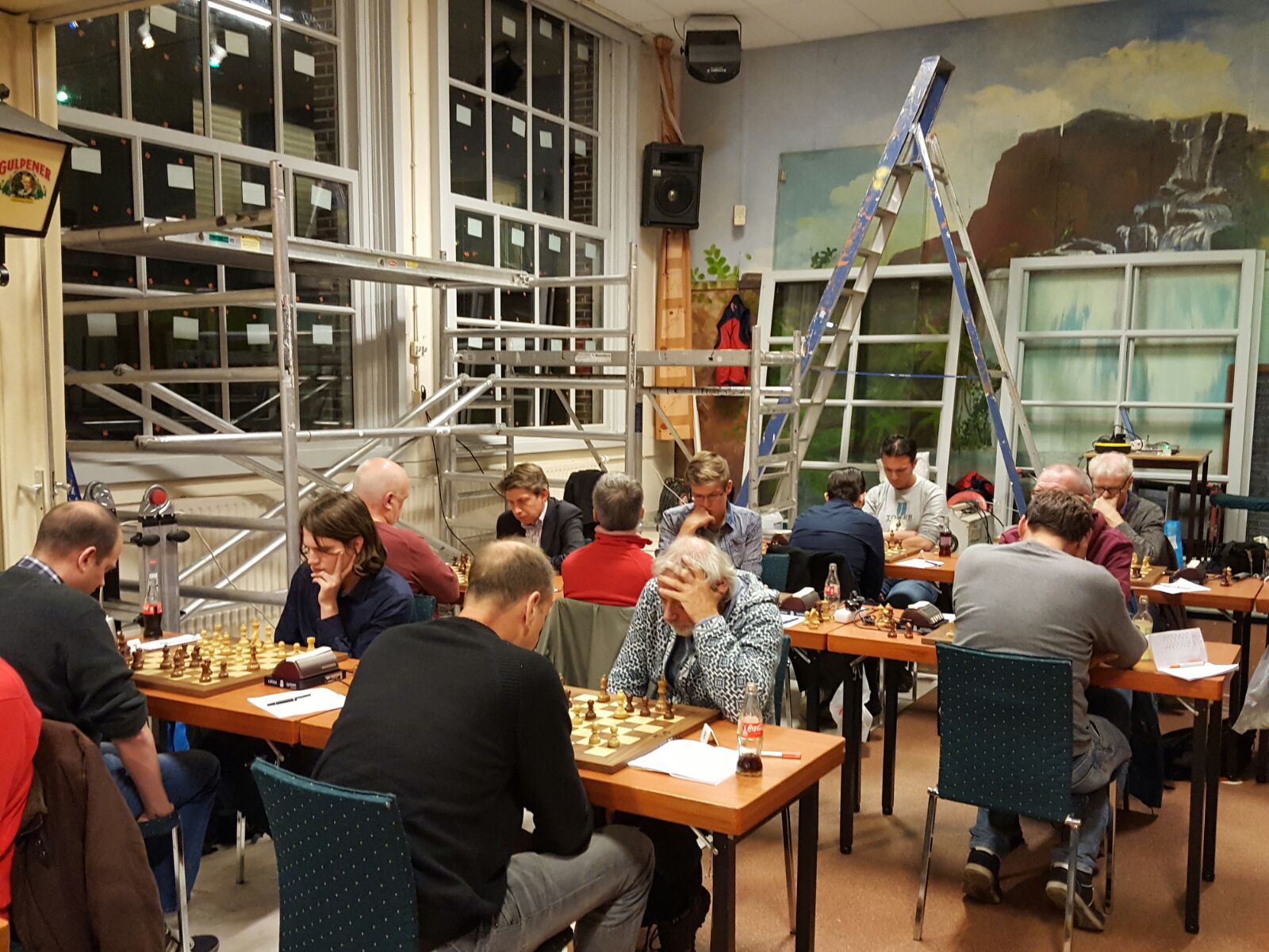 De formule is ongewijzigd: we spelen snelschaak partijen voor 50 cent per potje. De winst is vooraf al omgezet in voldoende bier, koffie, fris en wijn, en hopelijk een van de onvolprezen taarten van Chris!