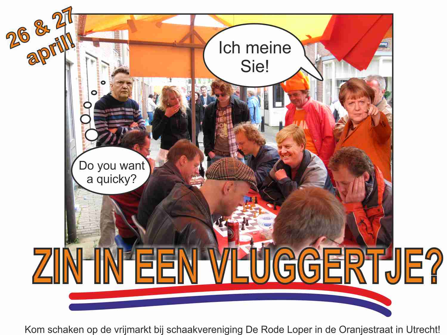 Komende zondag en maandag staan we als vanouds weer met onze schaakkraam op de Koningsmarkt. Onder het motto 'zin in een vluggertje' geven we naamsbekendheid aan de club en vieren we een schaakfeestje. Anton heeft zijn huis aan de Oranjestraat 39 (nabij de Weerdsluizen) weer beschikbaar gesteld!