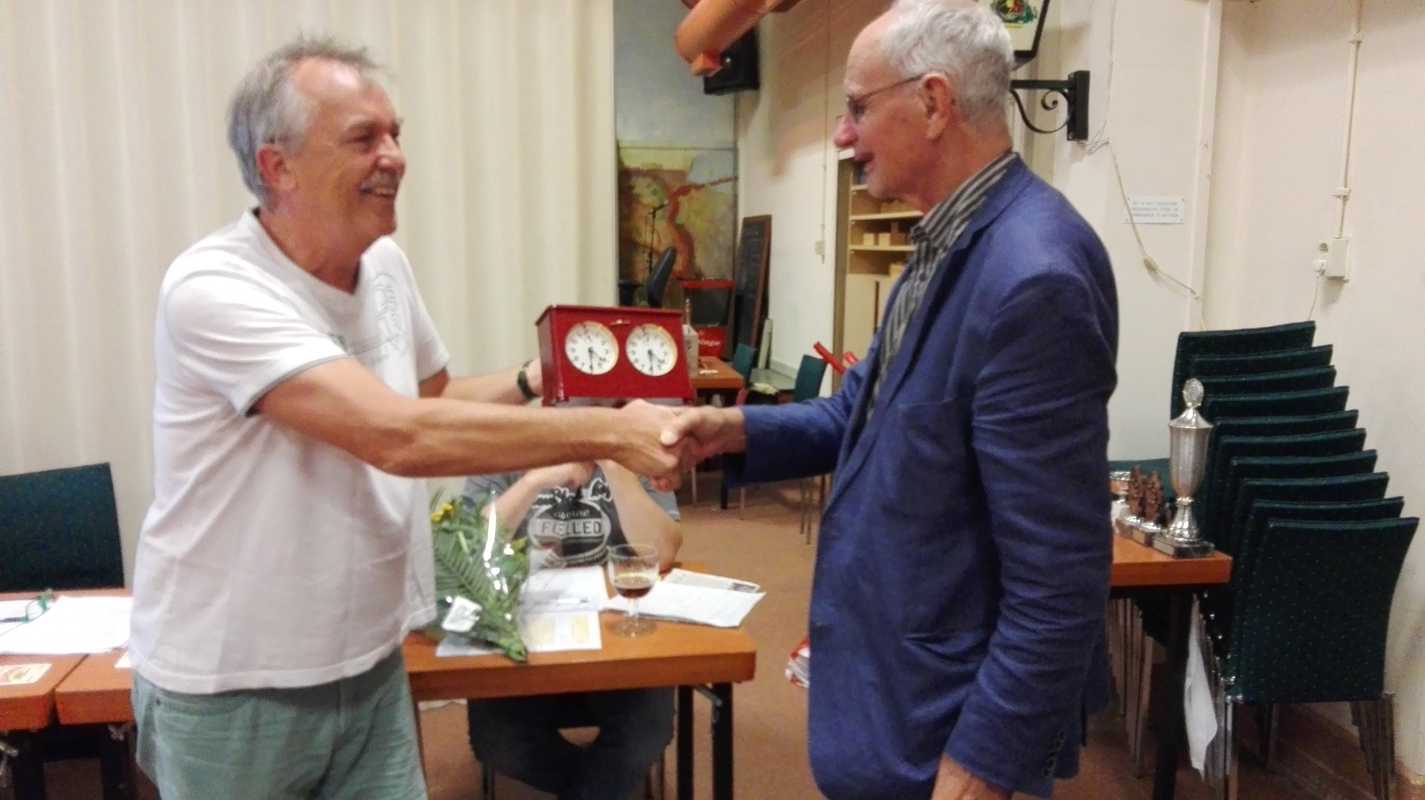 Afgelopen week werd in onze speelzaal de jaarvergadering gehouden. Naast de gebruikelijke onderdelen werd ook erelid Nico van Harten gehuldigd, hij is 65 jaar lid van onze vereniging. Het feit werd aangegrepen om de ELO-beker, de prijs voor de speler met de meeste interne ratingwinst, om te dopen in Nico van Harten Trofee. Voor dit doel is een klassieke klok opgelapt en rood geverft. Op bijgaande foto overhandigt voorzitter Geurt van der Wal de trofee aan de naamgever.