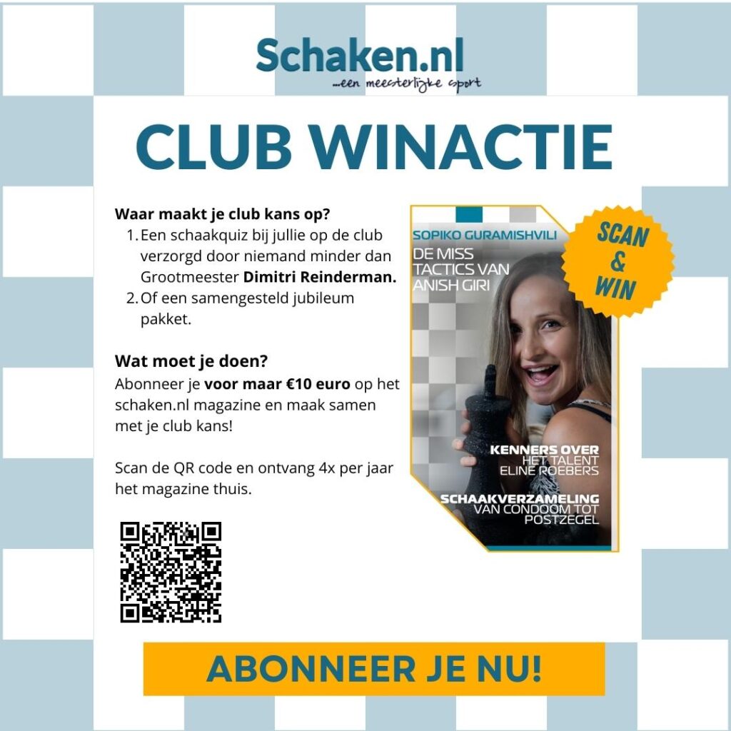 Abonneer je als lid voor maar €10 euro op het schaken.nl magazine. De club met het grootste aantal abonnees zal deze avond winnen.