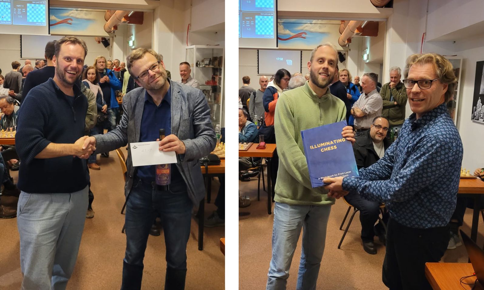 Rechts: Voorzitter Henk van Lingen feliciteert Bram Kierkels (l) met het winnen van het boek Illuminating Chess van fotograaf Fred Lucas