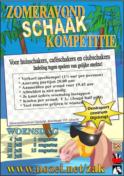 Hoewel het schaakseizoen voor de meeste verenigingen deze maand wordt afgesloten, wordt er in de zomer in Utrecht nog volop geschaakt. Op de woensdag kan je terecht in Denksportcentrum Dijckzigt voor de Zomer Avond Kompetitie. Dat wil zeggen: een echte schaakpartij in een zomers tempo en met zomerse prijzen. Dankzij de unieke indelingsformule speel je altijd een partij tegen een tegenstander van je eigen niveau. Elke ronde maak je kans op een van de rondeprijzen. En meedoen is zo vrijblijvend als je wil! Je hoeft je niet aan- of af te melden. Als je mee wilt doen, dan meld je je voor kwart voor acht aan in de zaal.