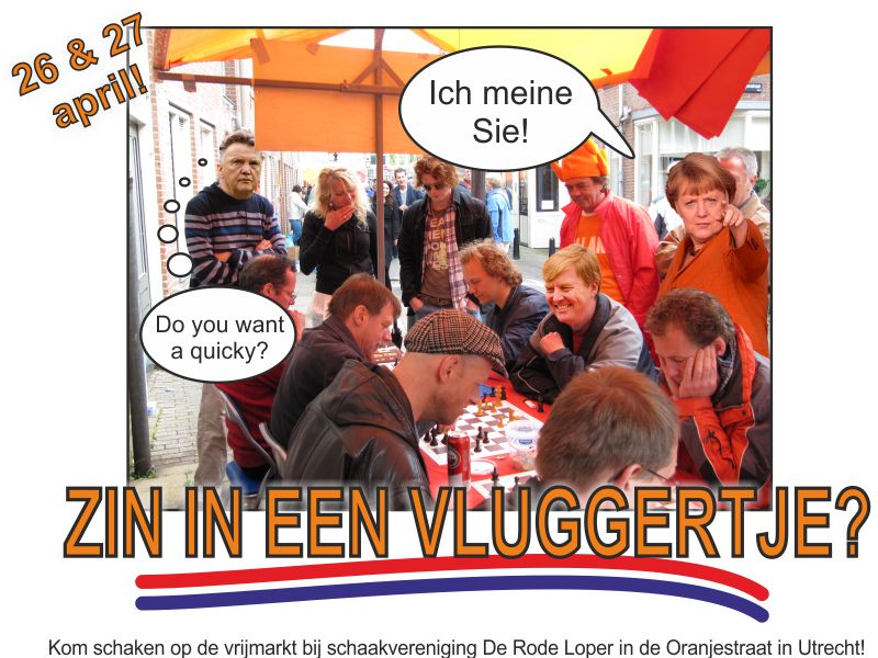 Onder het inmiddels bekende motto 'Zin in een vluggertje' staat de Rode Loper ook komende Koningsdag weer op de vrijmarkt! Onze befaamde schaakkraam wordt op donderdag 26 april opgebouwd en vanaf 18:00 uur wordt er min of meer non-stop doorgeschaakt tot de volgende middag 18:00 uur.